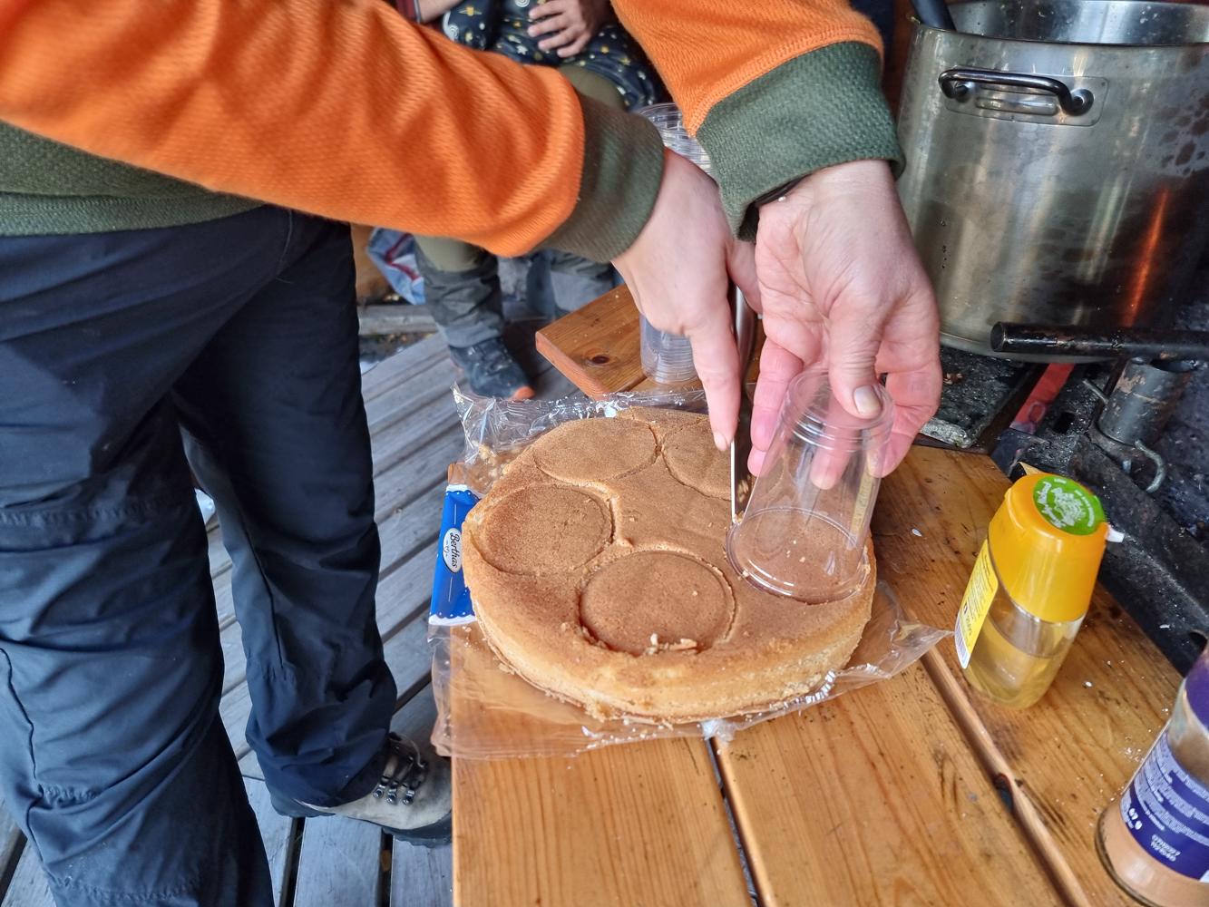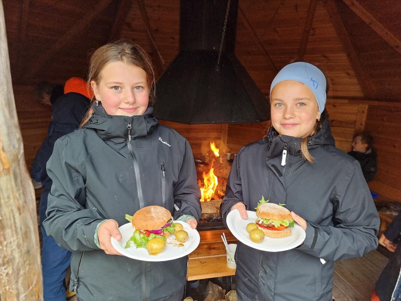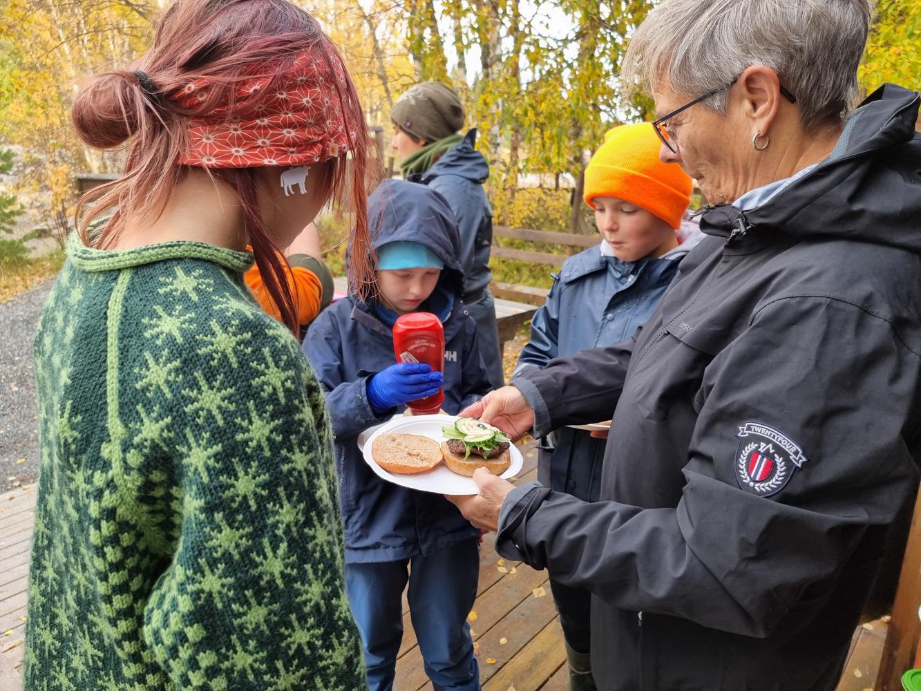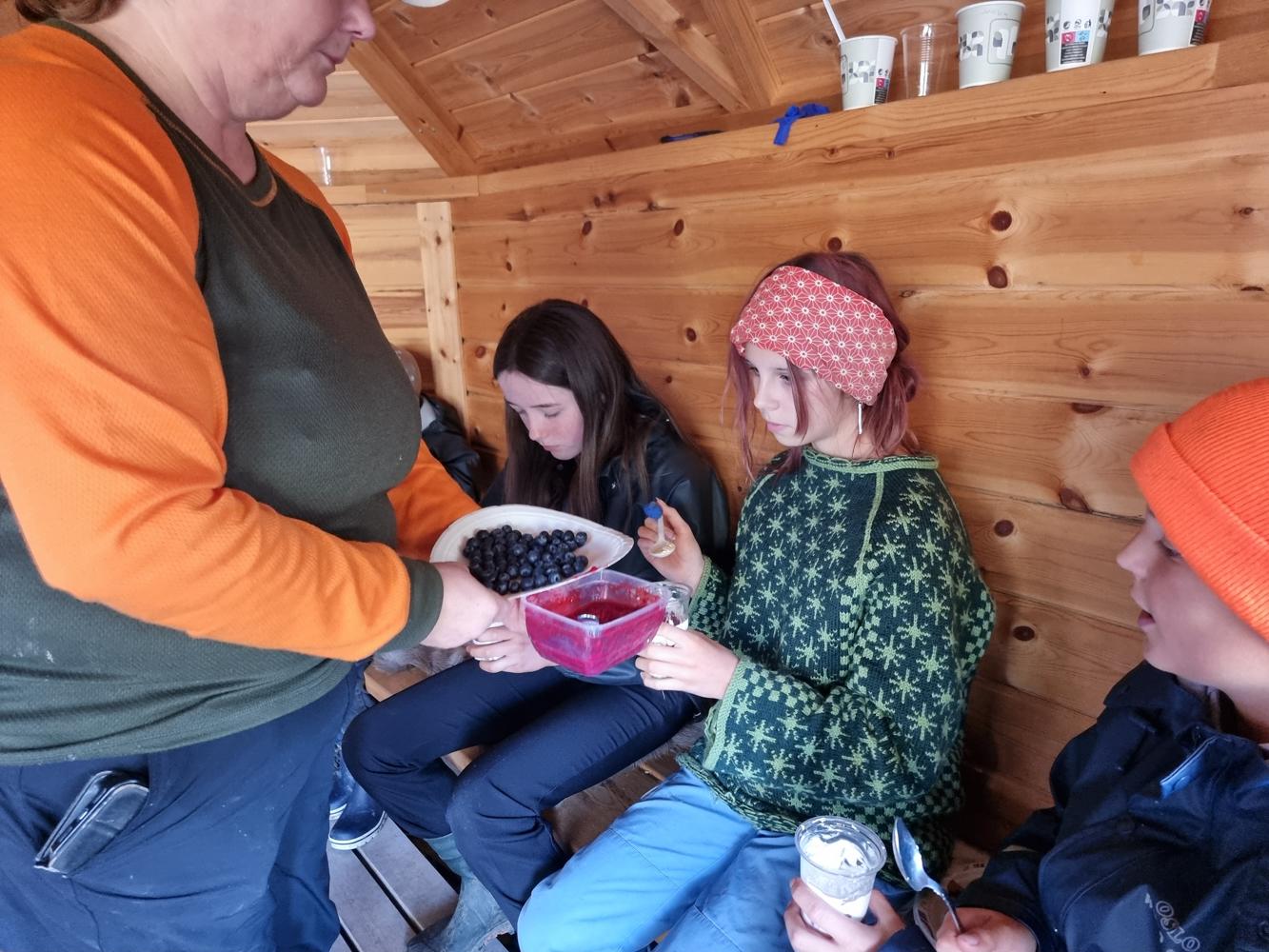 Menyen var som følgende: Bærsuppe, lammesuppe og elgburger med småpoteter. Og to desserter! Første dessert var pannekaker med epler eller bringebær og andre dessert var bløtkake i kopp. Gretes tips for bløtkake på tur: pisk krem hjemme og ta med i en kopp. Når det er bærsesong lager du bløtkaken ute på tur.