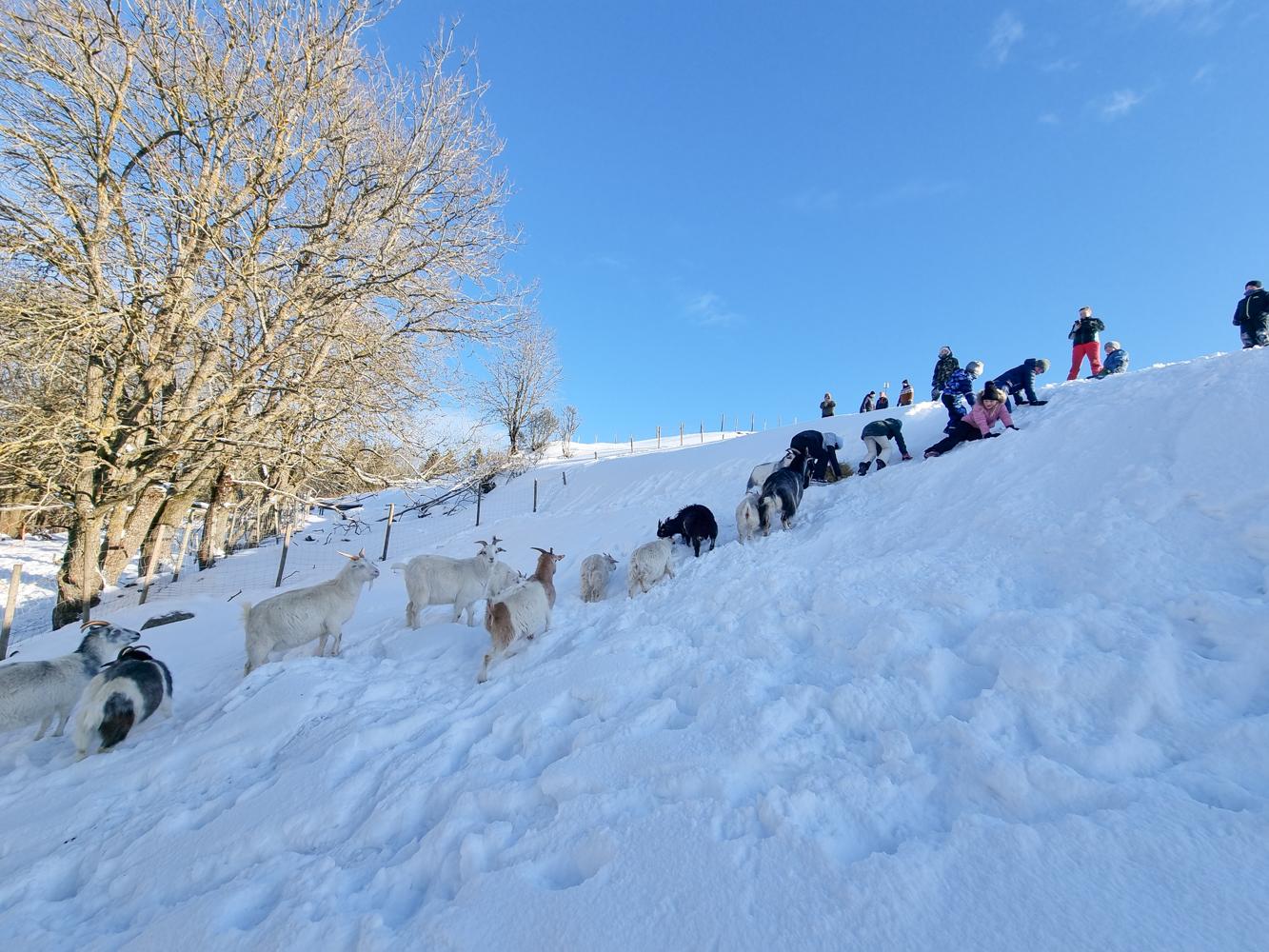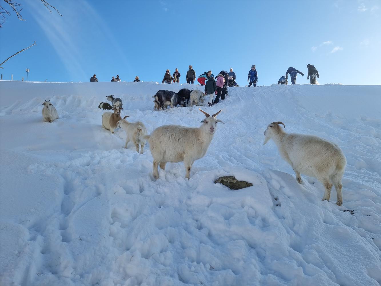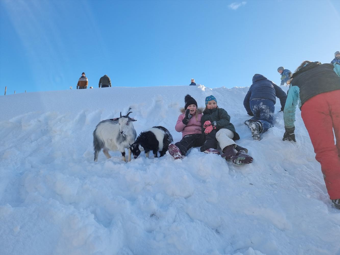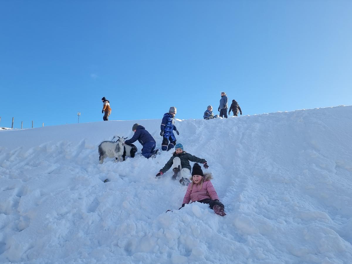 Da barna skulle gå tur med geitene, oppsto det en liten situasjon som var litt uklar: Var det geitene som ikke fullførte turen, eller var det barna som heller ville ake? Uansett endte det med full samling av både geiter og barn i bakken, til stor latter og glede.